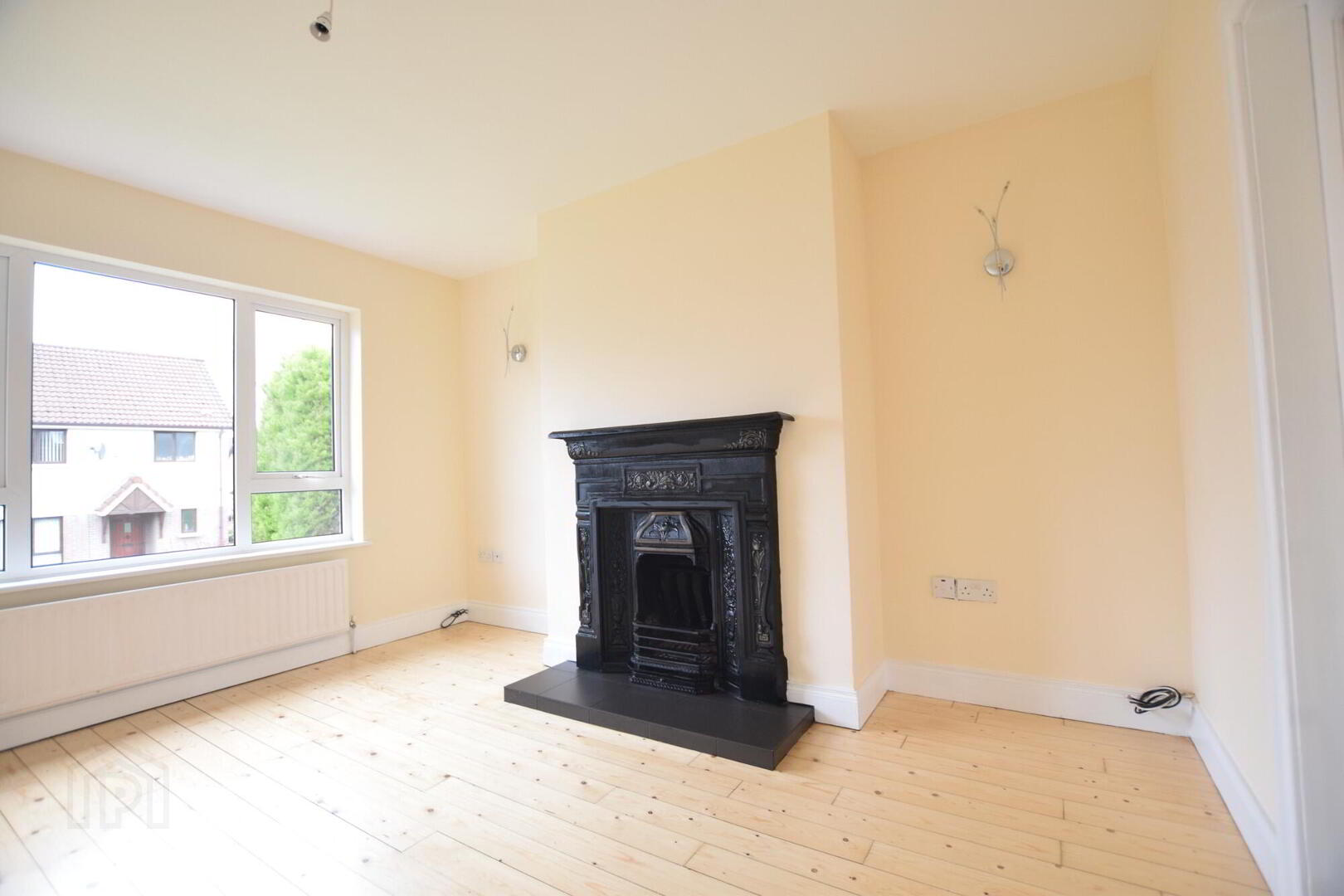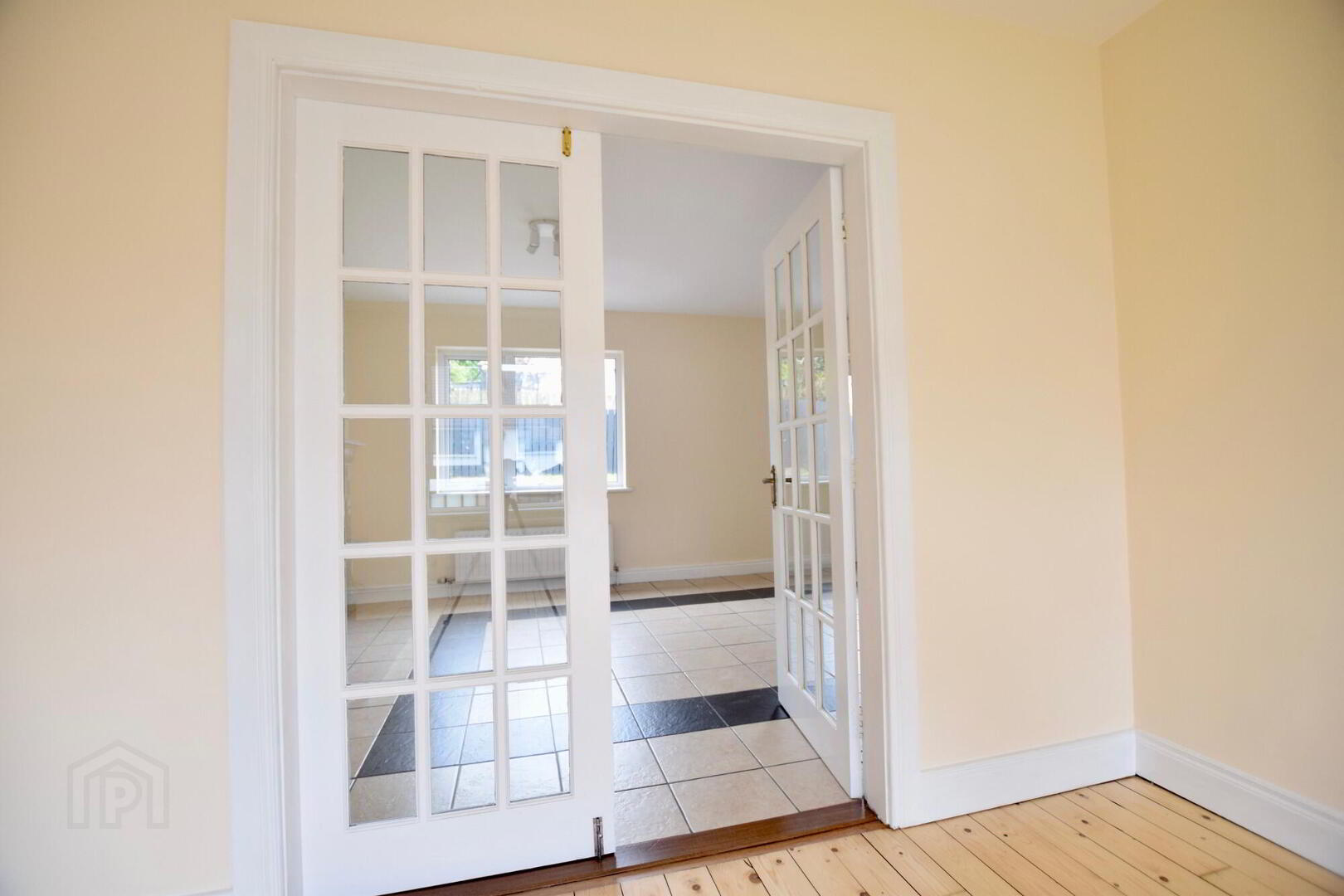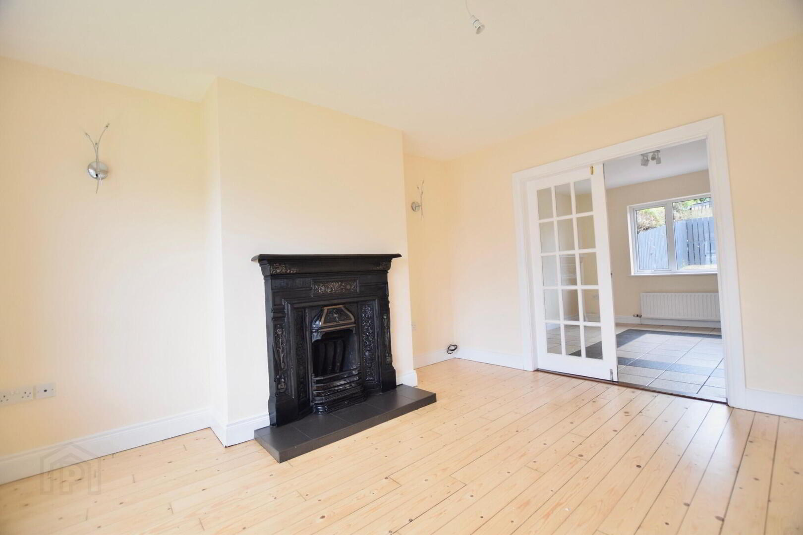Front facing living room. Wooden flooring, Fireplace with open fire. French doors to kitchen. TV point.