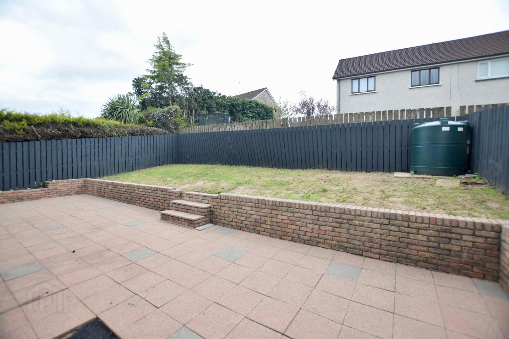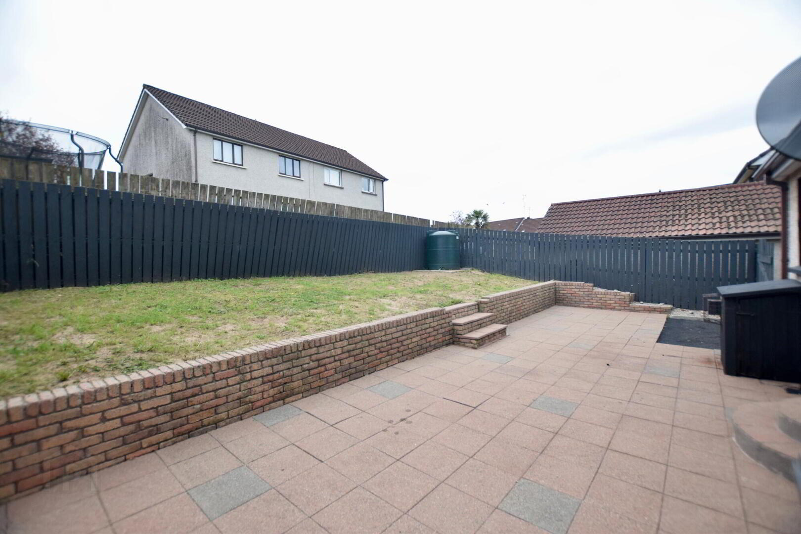 Front garden in lawn with driveway. Rear enclosed garden with paved area and raised grass area.