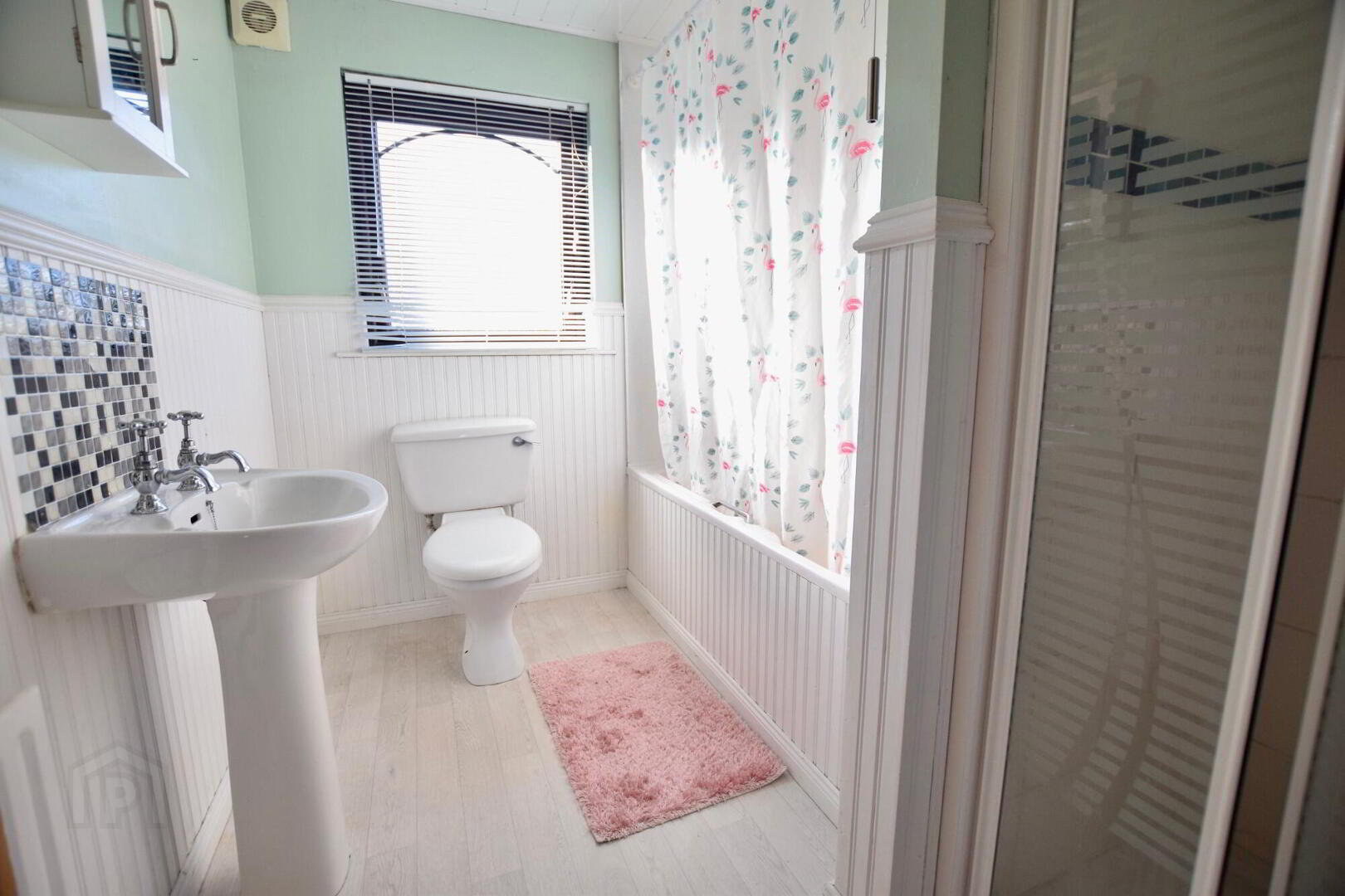 Vinyl flooring. WC. WHB. Bath with mixer taps. Separate shower.
