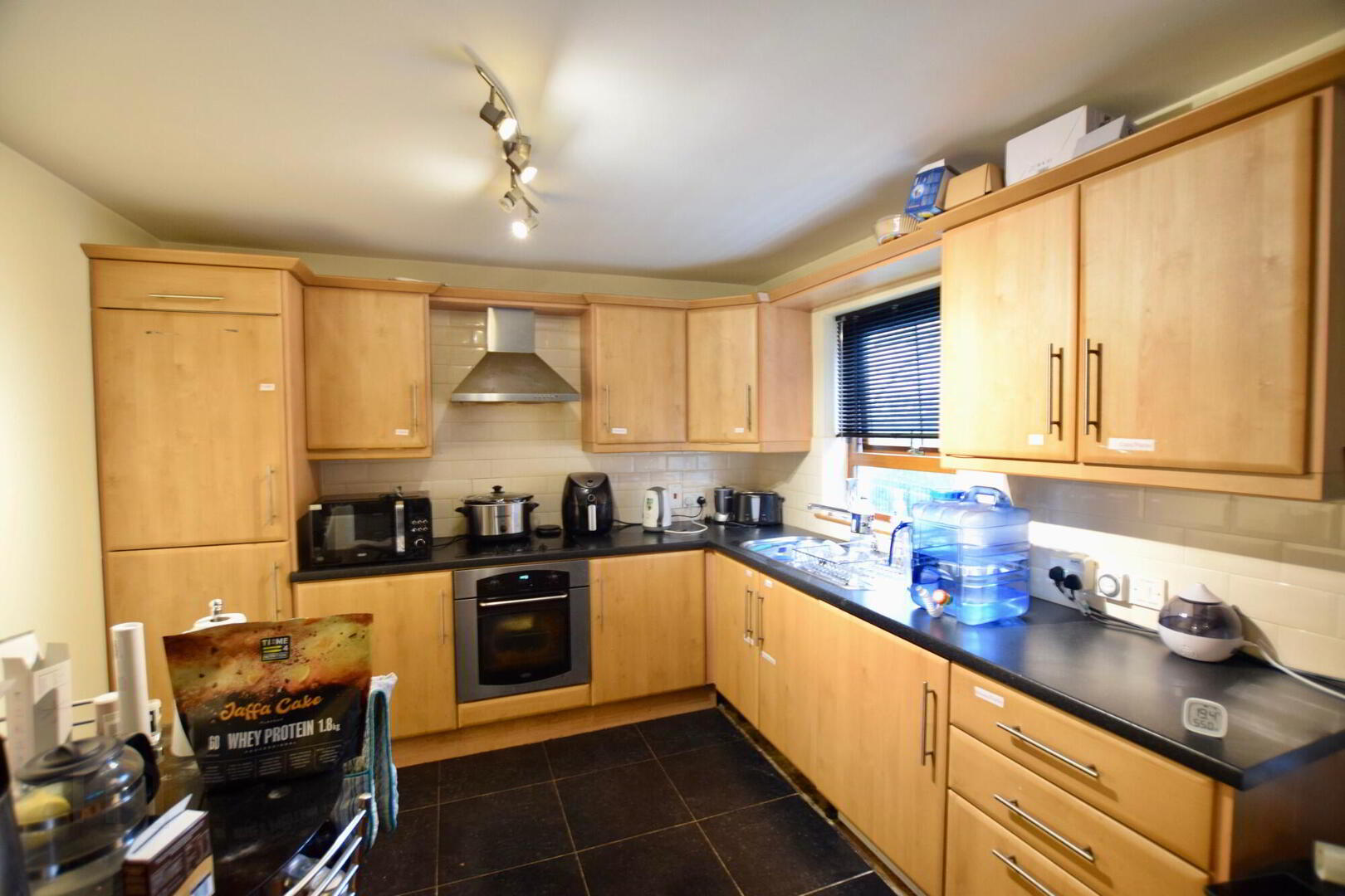 Front facing open plan living/dining/kitchen. Laminate flooring to living area. TV point. Fully fitted kitchen with high and low level units with tiling between. Tiled flooring.