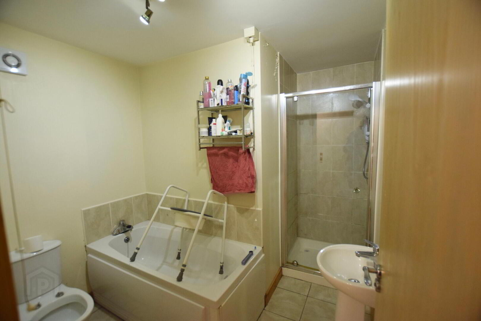 Bath, shower. W.C., W.H.B. Tiled flooring. Tiled walls.