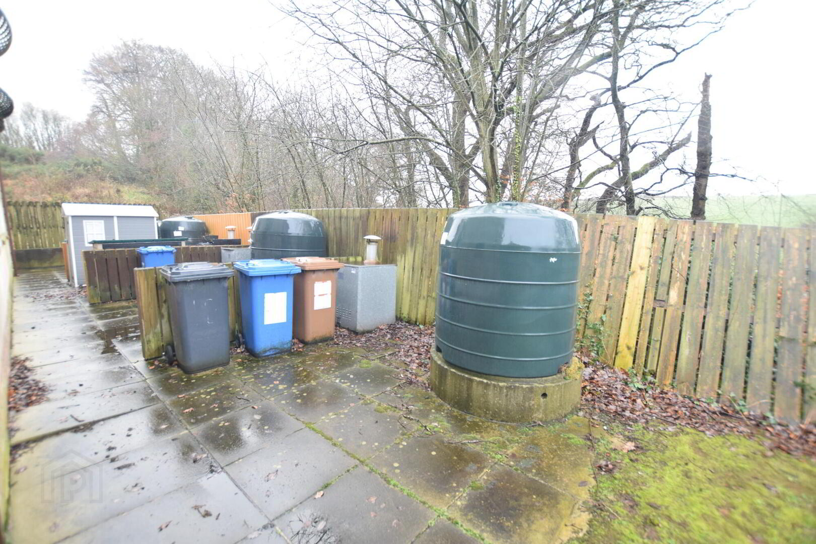 Rear paved area with oil tank and burner. Bin space.
