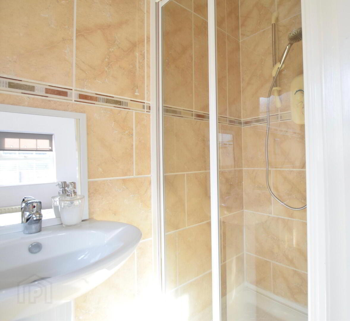 Rear facing Master bedroom. Laminate flooring. En-suite (2.6x1m), shower, WC, WHB, tiled floor & walls.