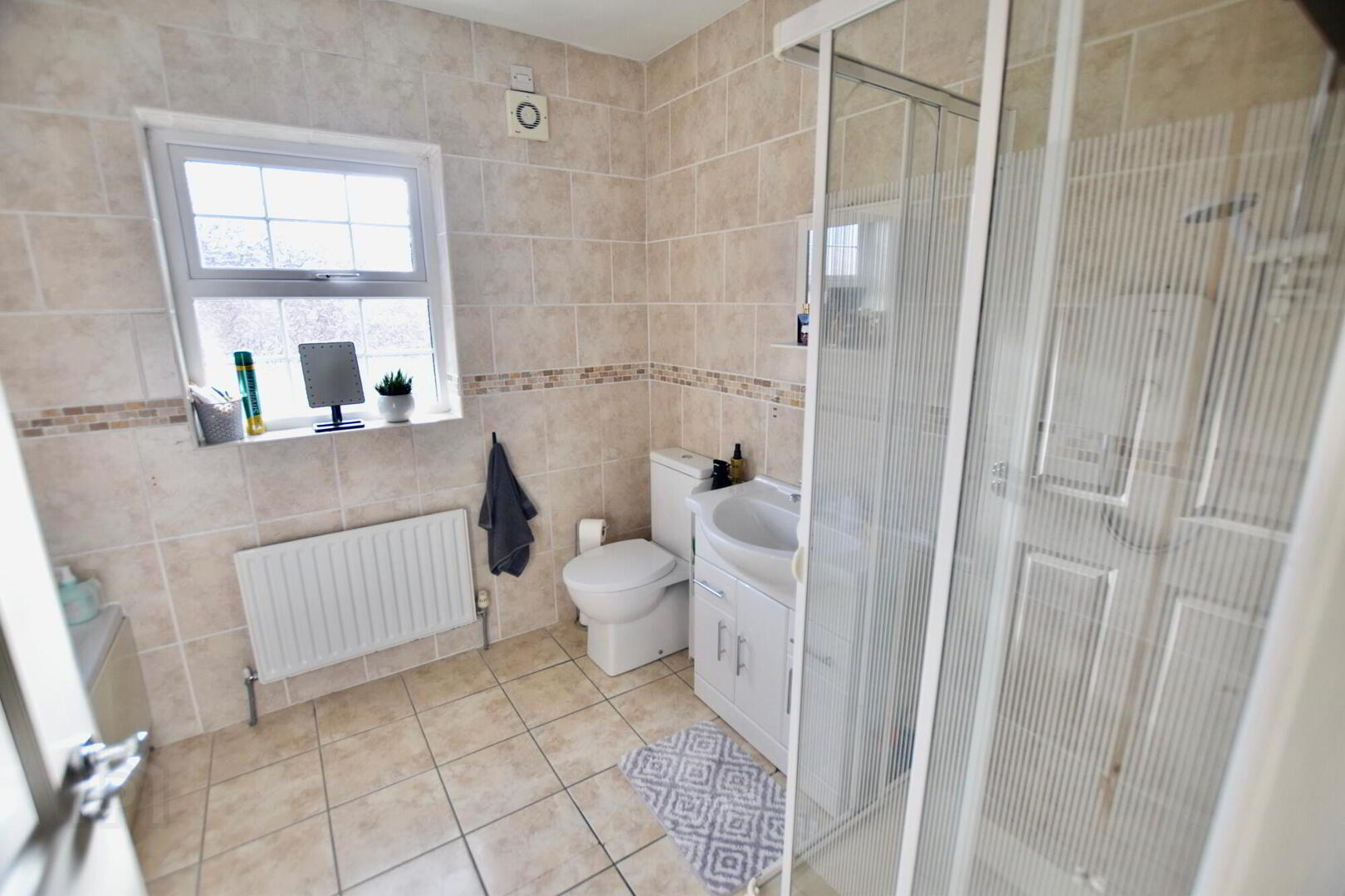 Tiled floor. Tiled walls. Bath, WHB in vanity unit. WC. Separate shower.