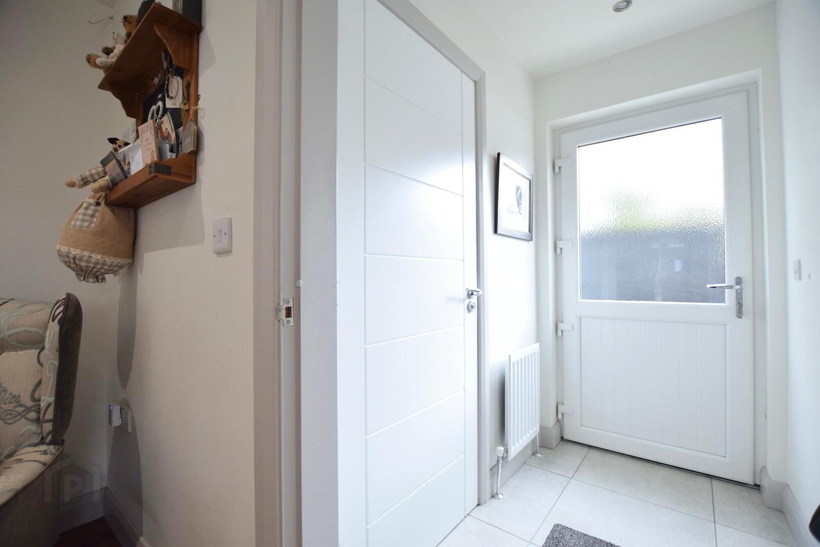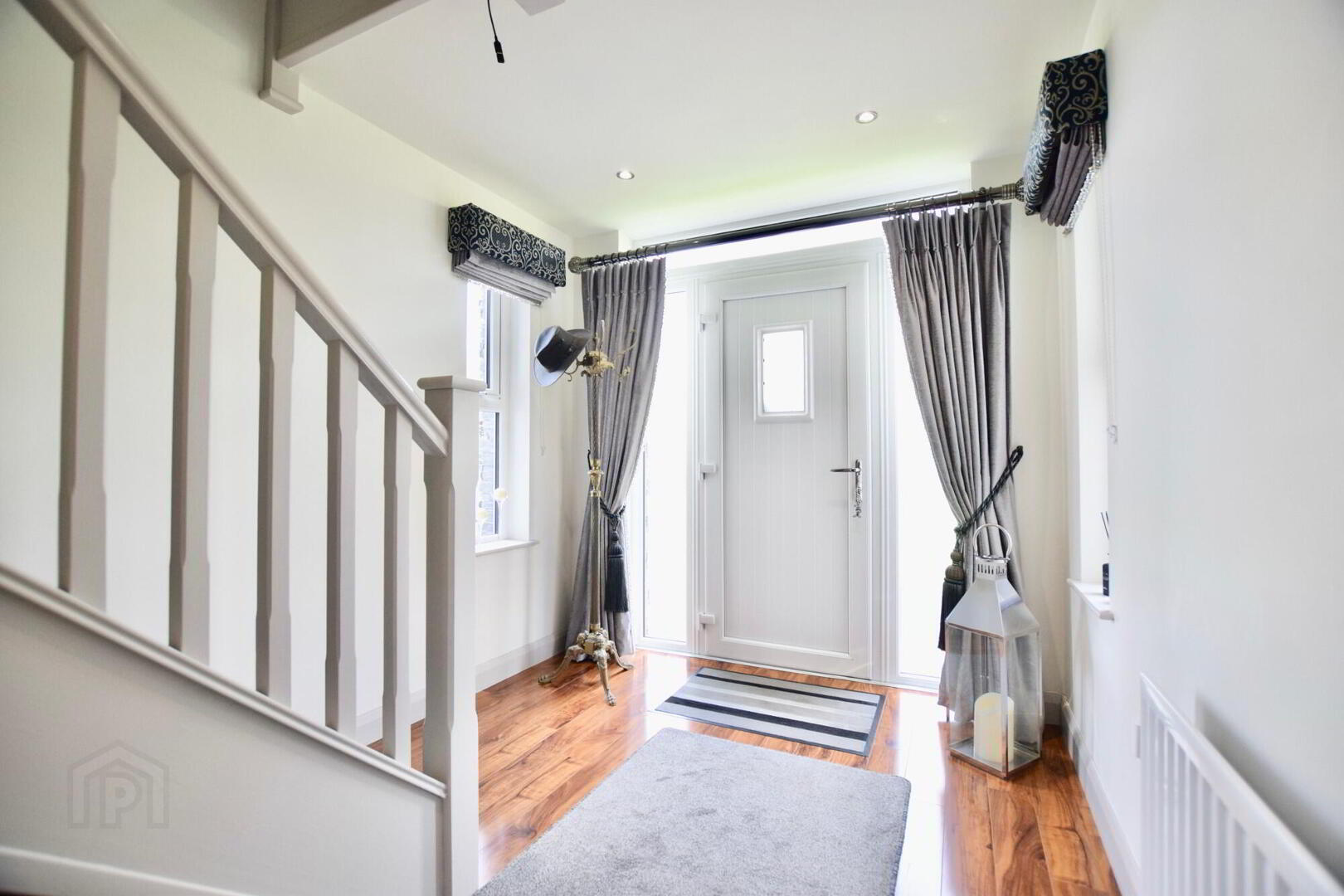 Part glazed PVC door with glazed side panels to spacious hallway with wooden flooring. Side facing windows. Phone point.