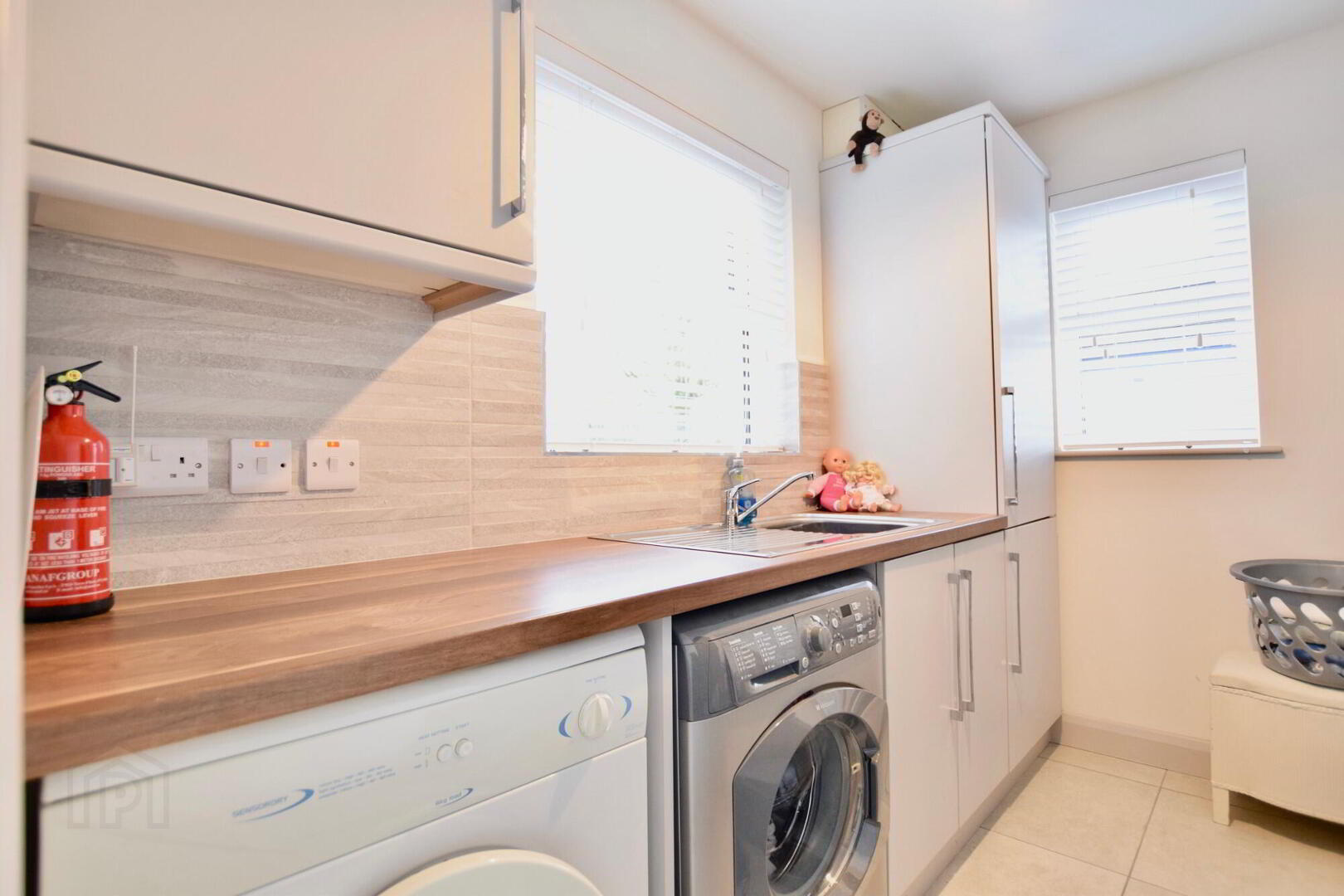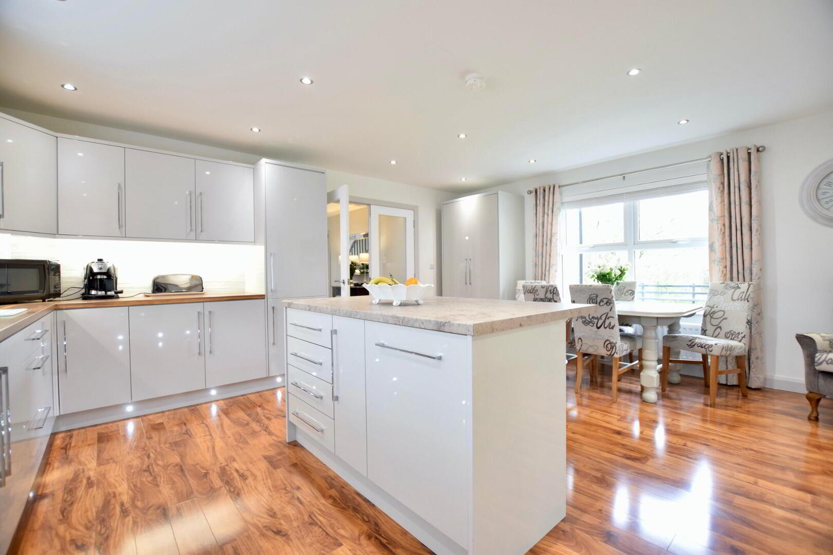 Fully fitted kitchen with high and low level units with tiling between. Kickboard and under counter lighting. Wooden flooring. Integrated oven/hob and dishwasher. Integrated fridge freezer. Breakfast bar/island. Adjoining dining area with glazed doors from hallway. TV point. Access to utility room.