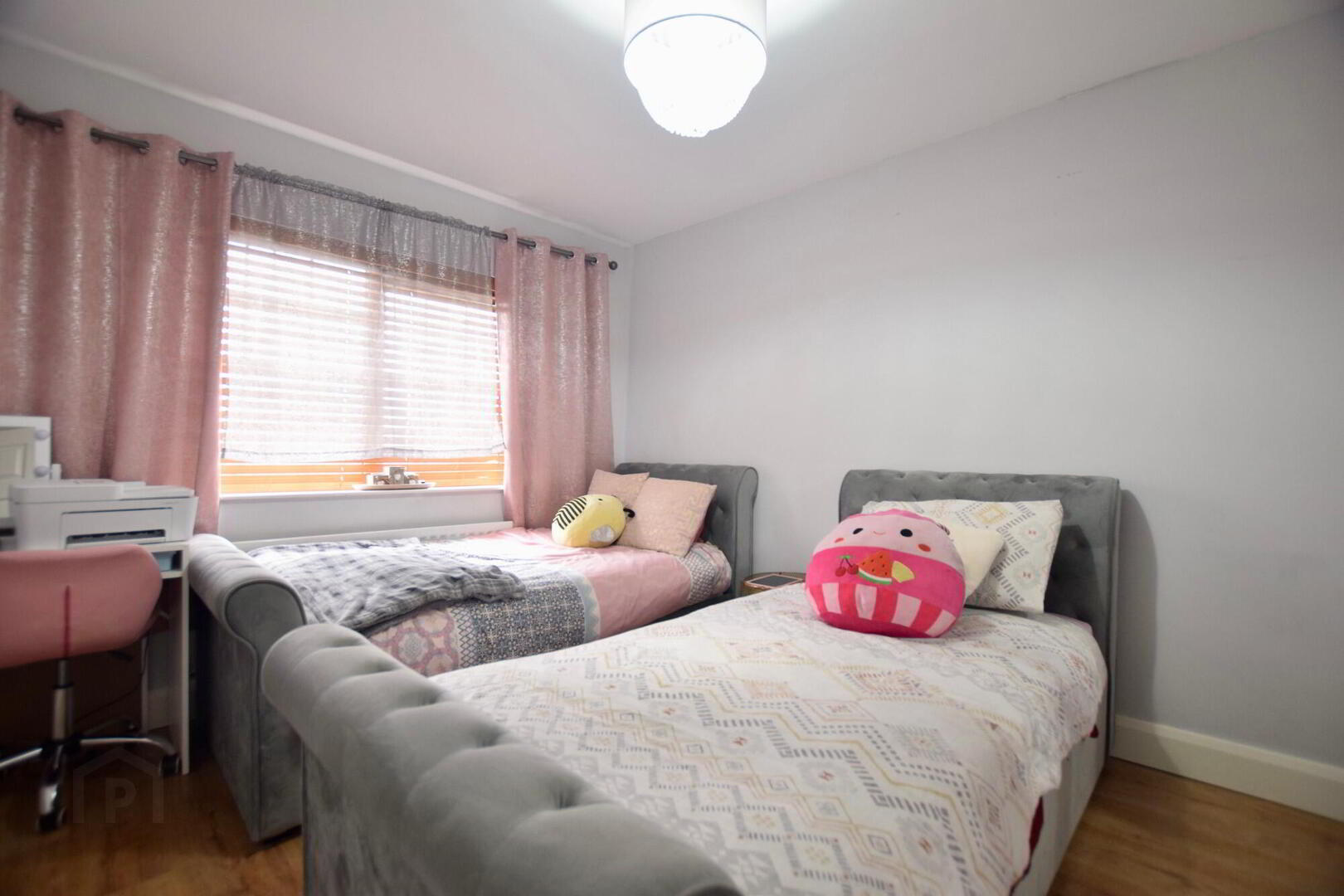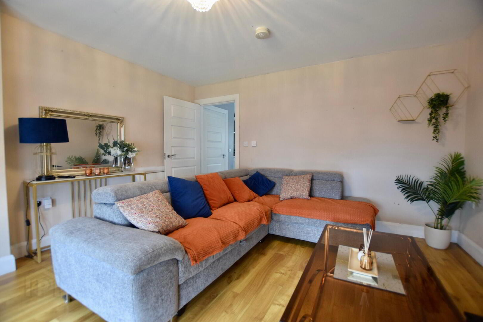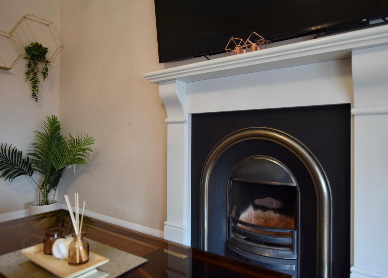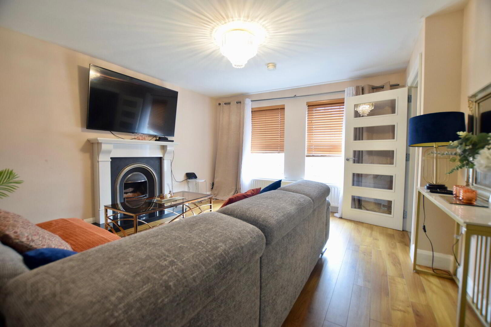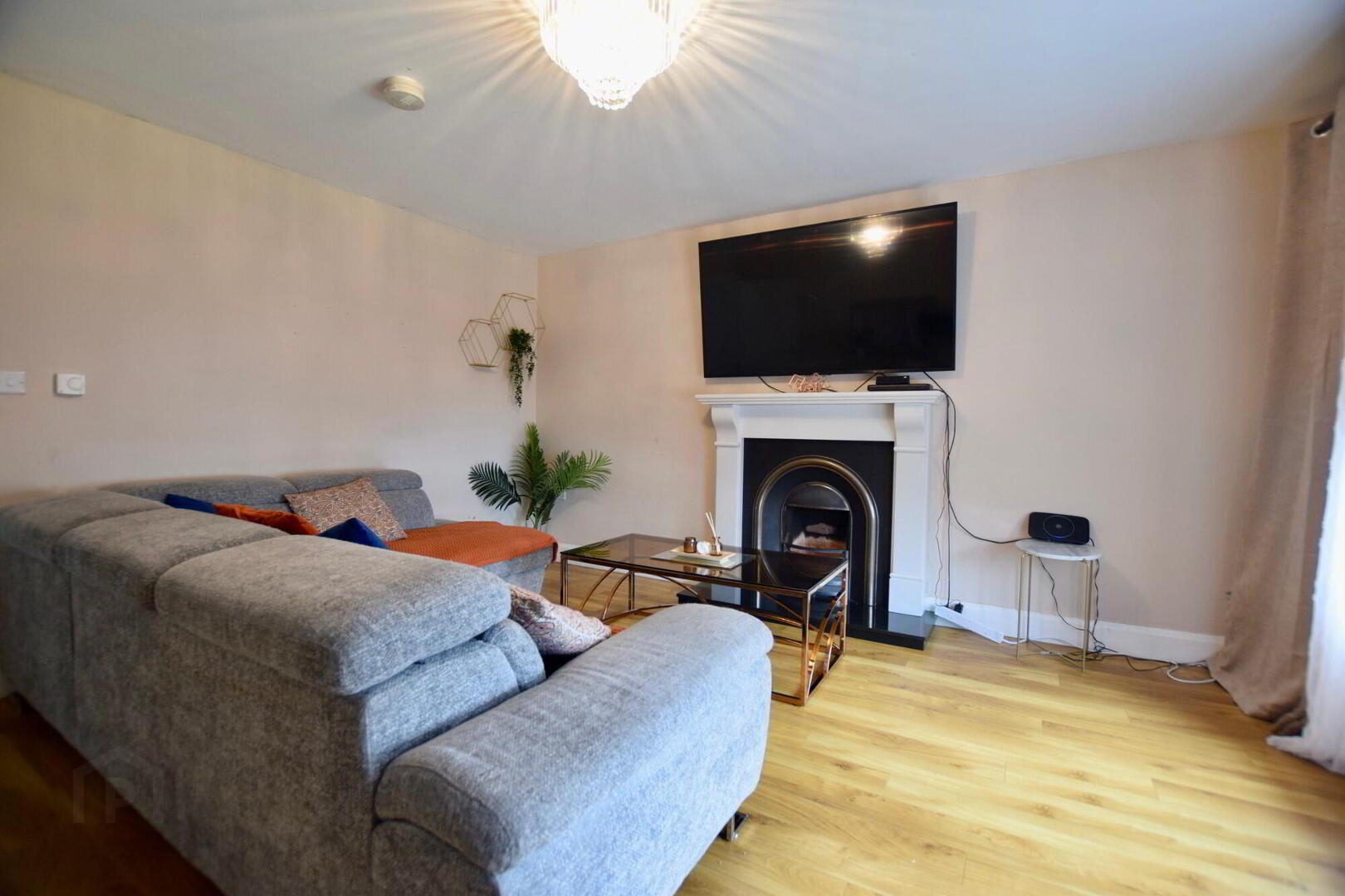 Front facing living room with twin windows. Laminate flooring. TV point. Under stair storage. Wood burning stove.