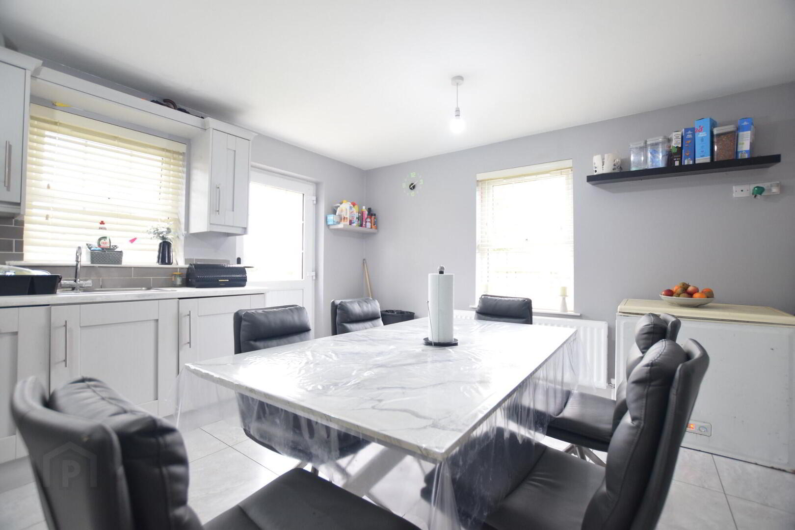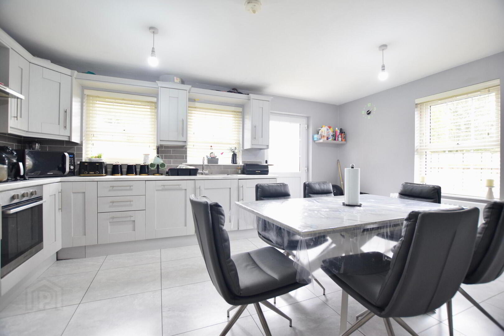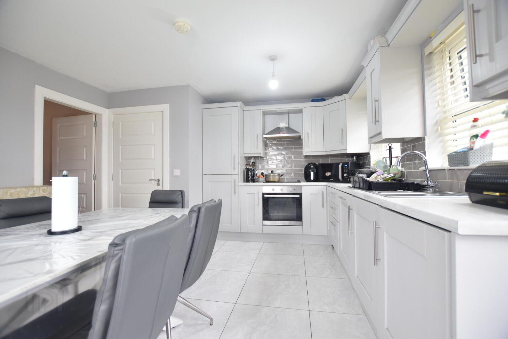 Fully fitted kitchen with high and low level units, tiled between units. Tiled floor. Integrated Oven/hob. Integrated fridge / freezer and dishwasher. Door to rear garden.