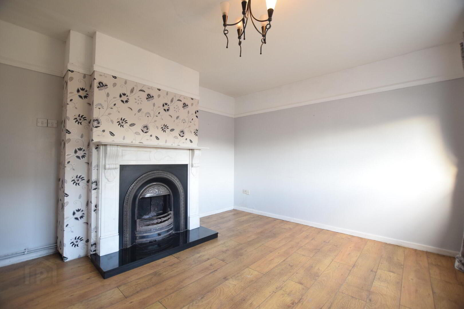 Front facing living room. Laminate flooring. TV point. Marble fireplace with open fire.