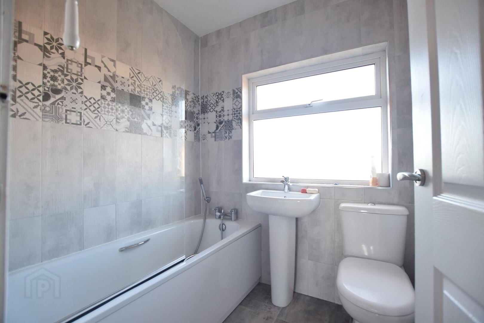 Bath with shower over. WHB. WC. Tiled walls. Tiled floor. LED Lighting.
