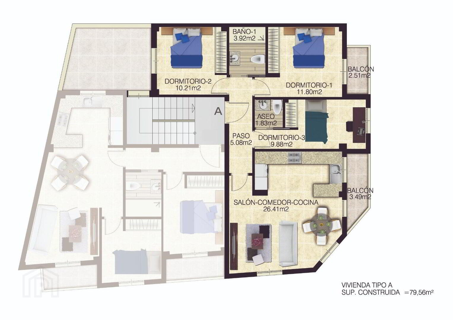 Type A properties have 3 bedrooms with fitted wardrobes, 1 complete bathroom, 1 toilet, exterior balconies and a spacious and bright living-dining room area with open plan kitchen.