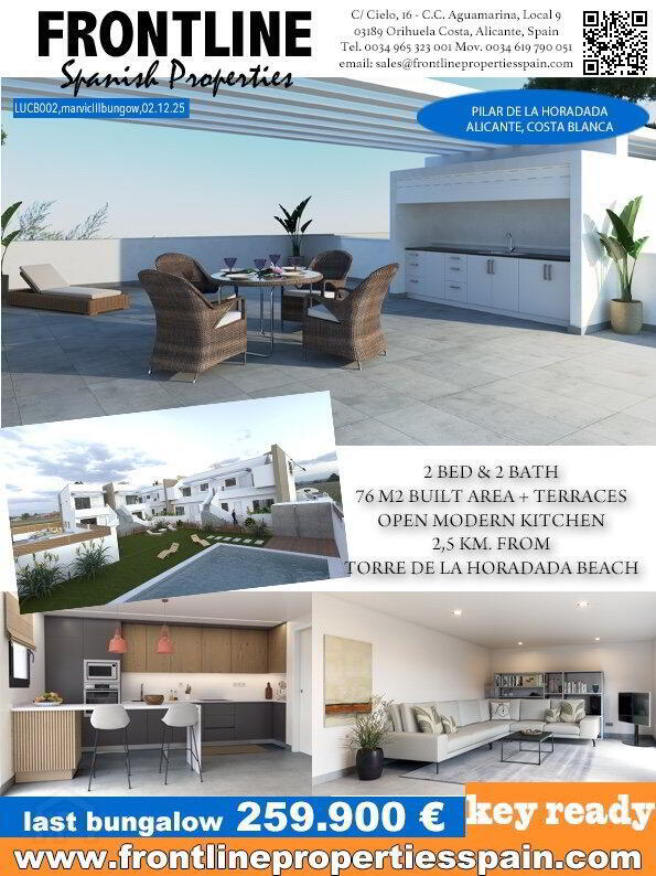In a privileged setting next to the Mediterranean Sea, we find this small residential complex consisting of single-storey and two-storey bungalows just 2.5 km from the fantastic beaches of Torre de La Horadada, the southernmost town in the province of Alicante and bordering the first town in the Region of Murcia, called San Pedro del Pinatar.