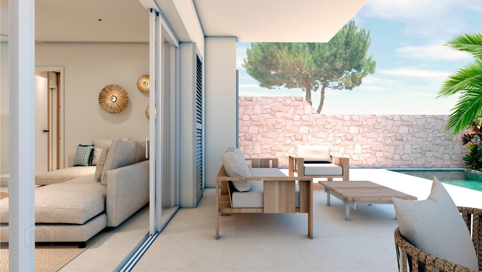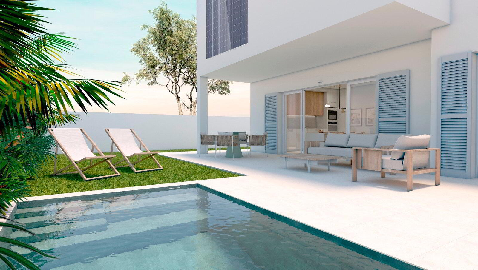 * The ground floor bungalows have a constructed area of 84m2, with a terrace of 83m2, 3 bedrooms, 2 bathrooms and a private swimming pool.