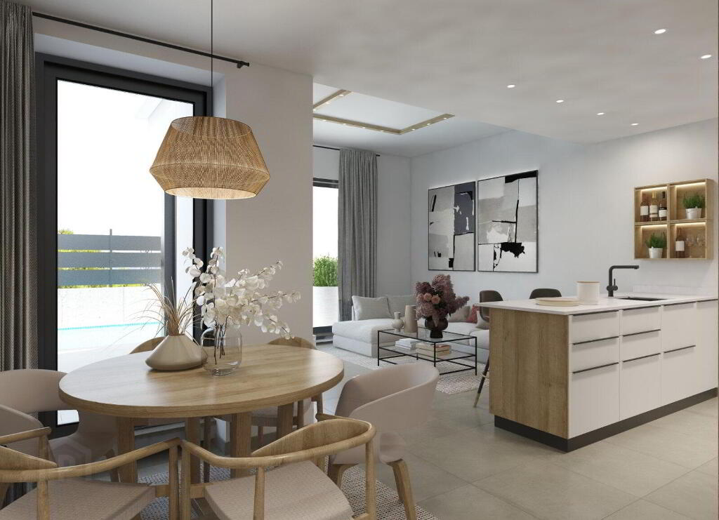 The villas are built on plots of 164m2. They have a constructed area of 109 m2. Each property has 3 bedrooms and 2 bathrooms and has been designed with an open concept, consisting of a fully fitted kitchen and living-dining room.