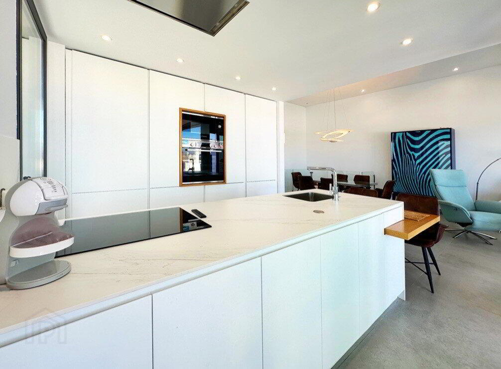 The magnificent family home with cascading infinity pool enjoys excellent sea views with panoramic views of the Bay of Guardamar and Santa Pola. The property comprise three bedrooms with fitted wardrobes and en-suite shower rooms and 1 guest toilet, a fully-fitted modern integrated kitchen with breakfast bar and open-plan living/dining room, leading to the garden with covered outside dining space. The main floor has a double bedroom with dressing room. On the lower floor there is a large family room with underwater pool observatory. Two double bedrooms with access to the tropical patio garden, seating area and direct access to the garage area. A unique opportunity which invites you to enjoy Mediterranean life from the first moment.