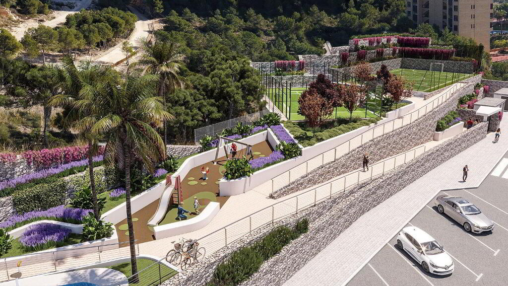 The sea, golf and life in Benidorm can all be enjoyed in this project. Privileged location, next to "Las Rejas Golf", only 1km from Poniente beach and with excellent communications with the N-332 and AP7. The building will have a single tower with a variety of apartaments, where you can choose between 1, 2, 3 and 4 bedrooms, with parking space and large terraces with glass railings that will allow you to enjoy more light and views from your home. In addition, the development includes 5,400 square metres of beautiful communal areas with: adult pool, children's pool, 2 jacuzzis, children's area, equipped gym, paddle court, multi-sports court, green areas and several bicycle parking spaces.