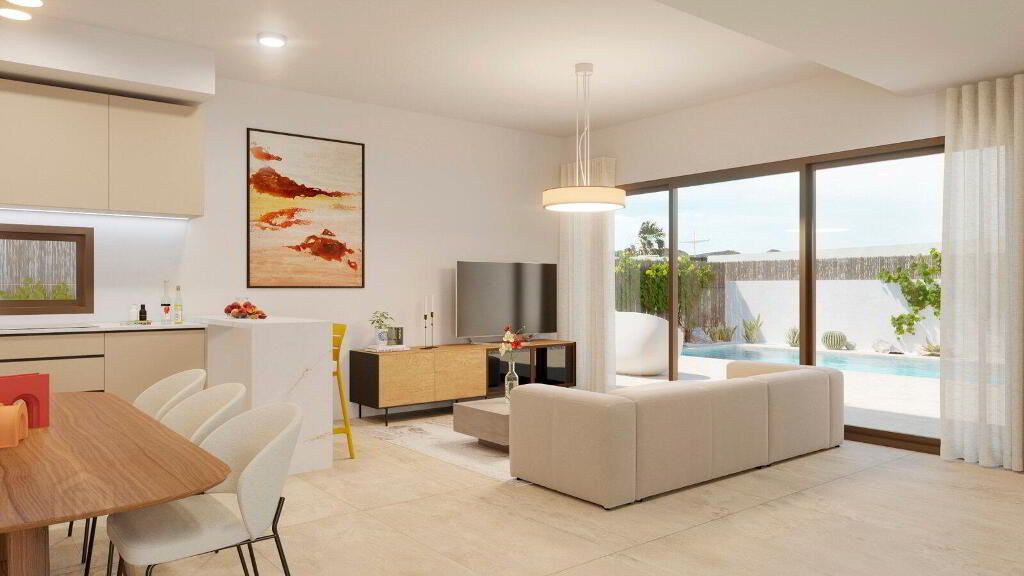 An open plan kitchen area that harmonizes perfectly with the living area and a double orientation that connects the interior with the exterior areas.