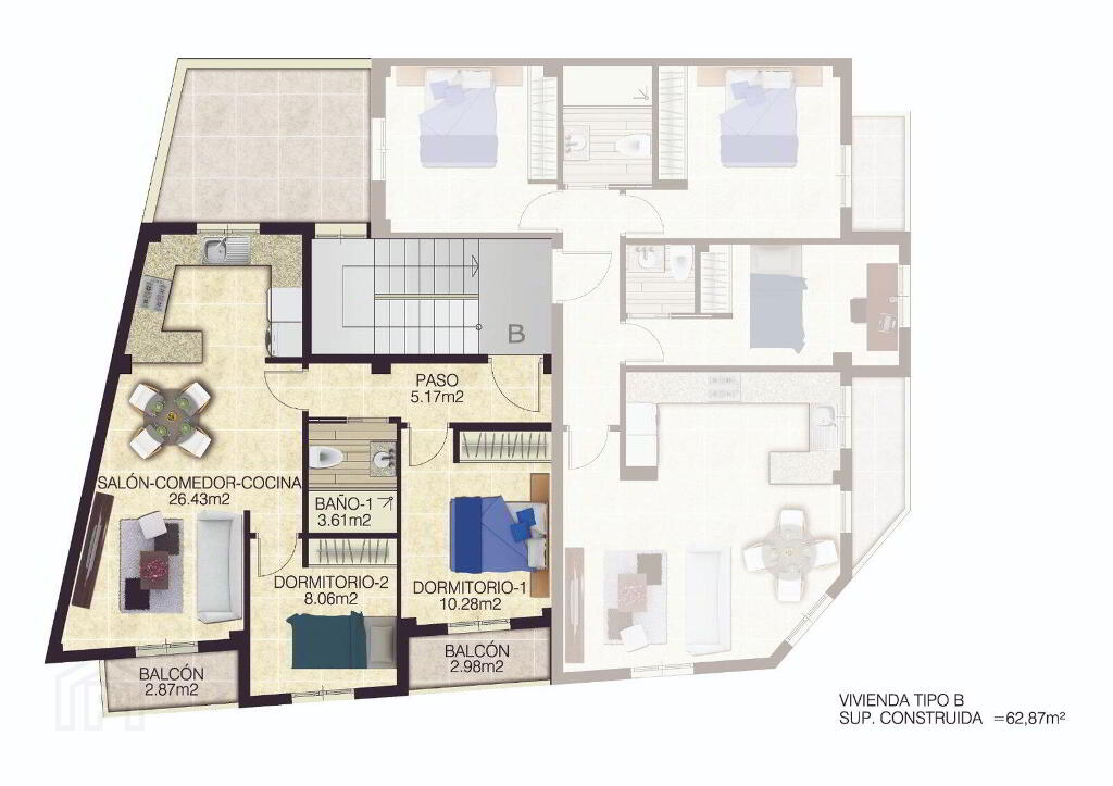 Type B properties have 2 bedrooms with fitted wardrobes, 1 complete bathroom, exterior balconies and a spacious and bright living-dining room area with open plan kitchen.