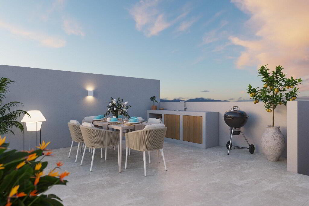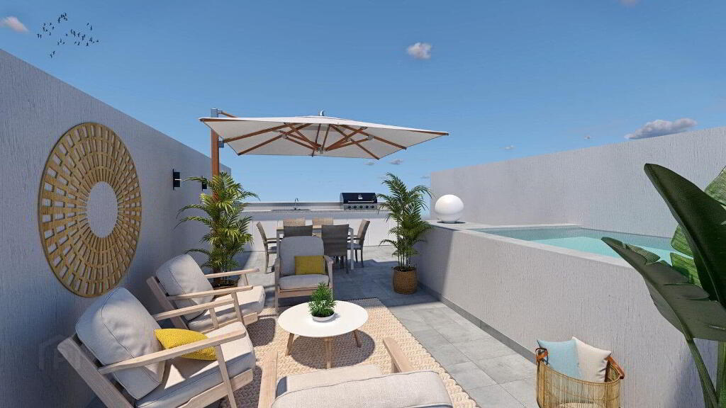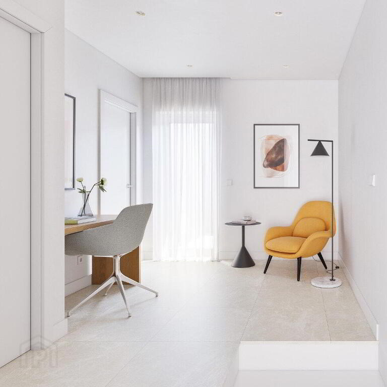 This duplex still awaits a very special part: its upper floor. As you go up the staircase you reach a chill out area, anteroom to the solarium: a cosy corner with a reading area and a desk.