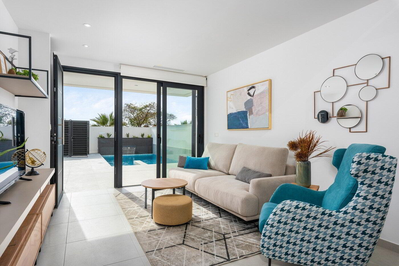 The residential consists of 11 modern style villas on private plots with terraces, parking area and private swimming pool. The properties consist of a living/dining room, open plan fitted kitchen, 2 bedrooms, 2 bathrooms and a double height reading/office area with great views. All of them have the option of a solarium, although only 5 of them have a basement. Carefully designed with high quality materials to satisfy the needs of the most demanding clients.