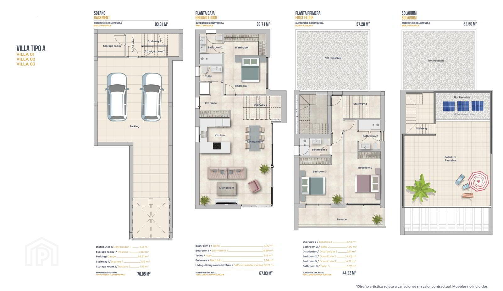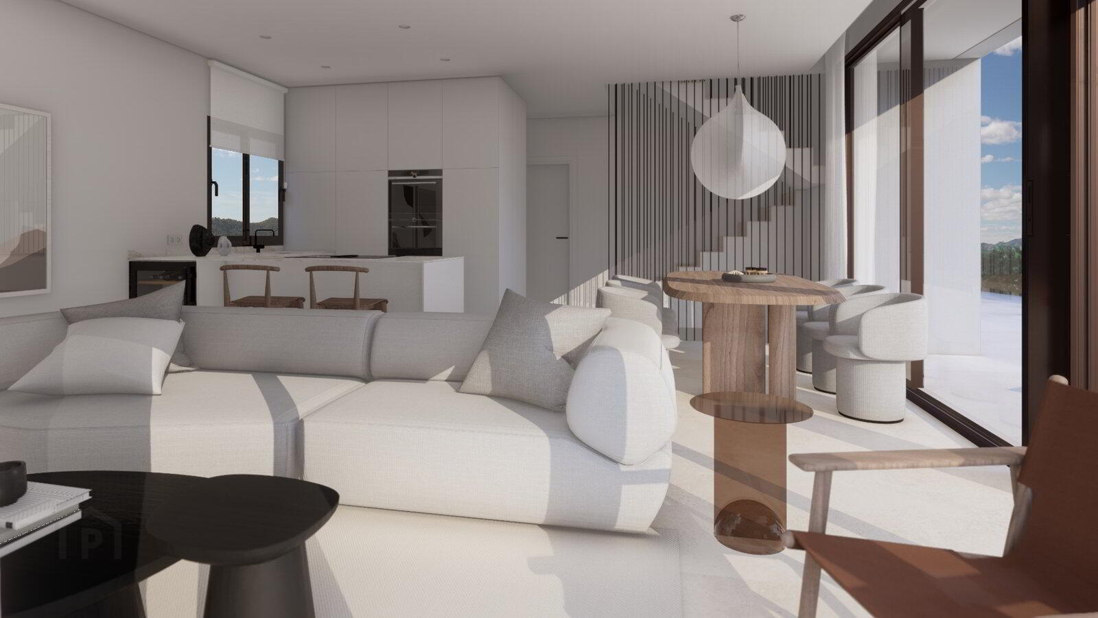 The villas with an area of 141,5 m2 plus terraces of 27,5m2 and a solarium of 52,5 m2 have views of the sea, the golf club and the famous postcard mountain Puig Campana.