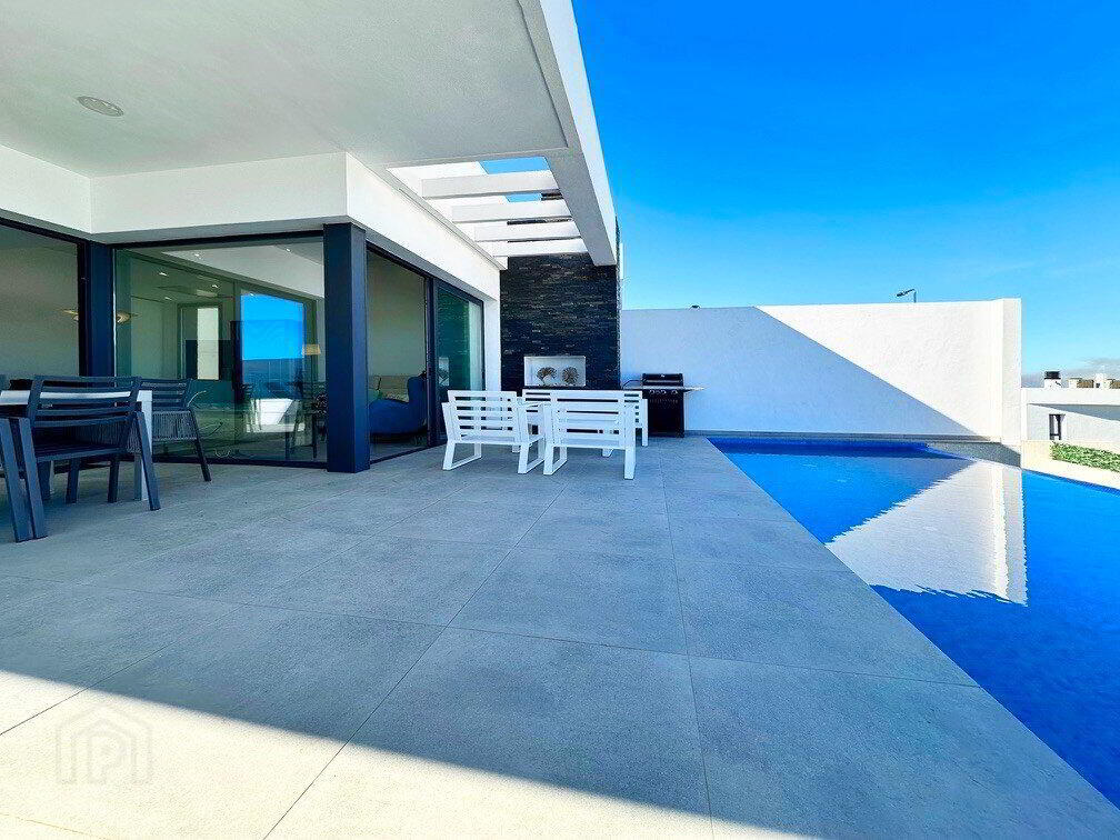 The magnificent family home with cascading infinity pool enjoys excellent sea views with panoramic views of the Bay of Guardamar and Santa Pola. The property comprise three bedrooms with fitted wardrobes and en-suite shower rooms and 1 guest toilet, a fully-fitted modern integrated kitchen with breakfast bar and open-plan living/dining room, leading to the garden with covered outside dining space. The main floor has a double bedroom with dressing room. On the lower floor there is a large family room with underwater pool observatory. Two double bedrooms with access to the tropical patio garden, seating area and direct access to the garage area. A unique opportunity which invites you to enjoy Mediterranean life from the first moment.