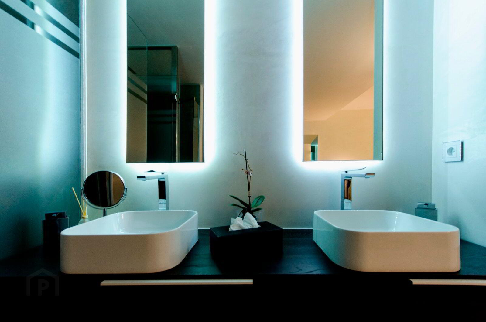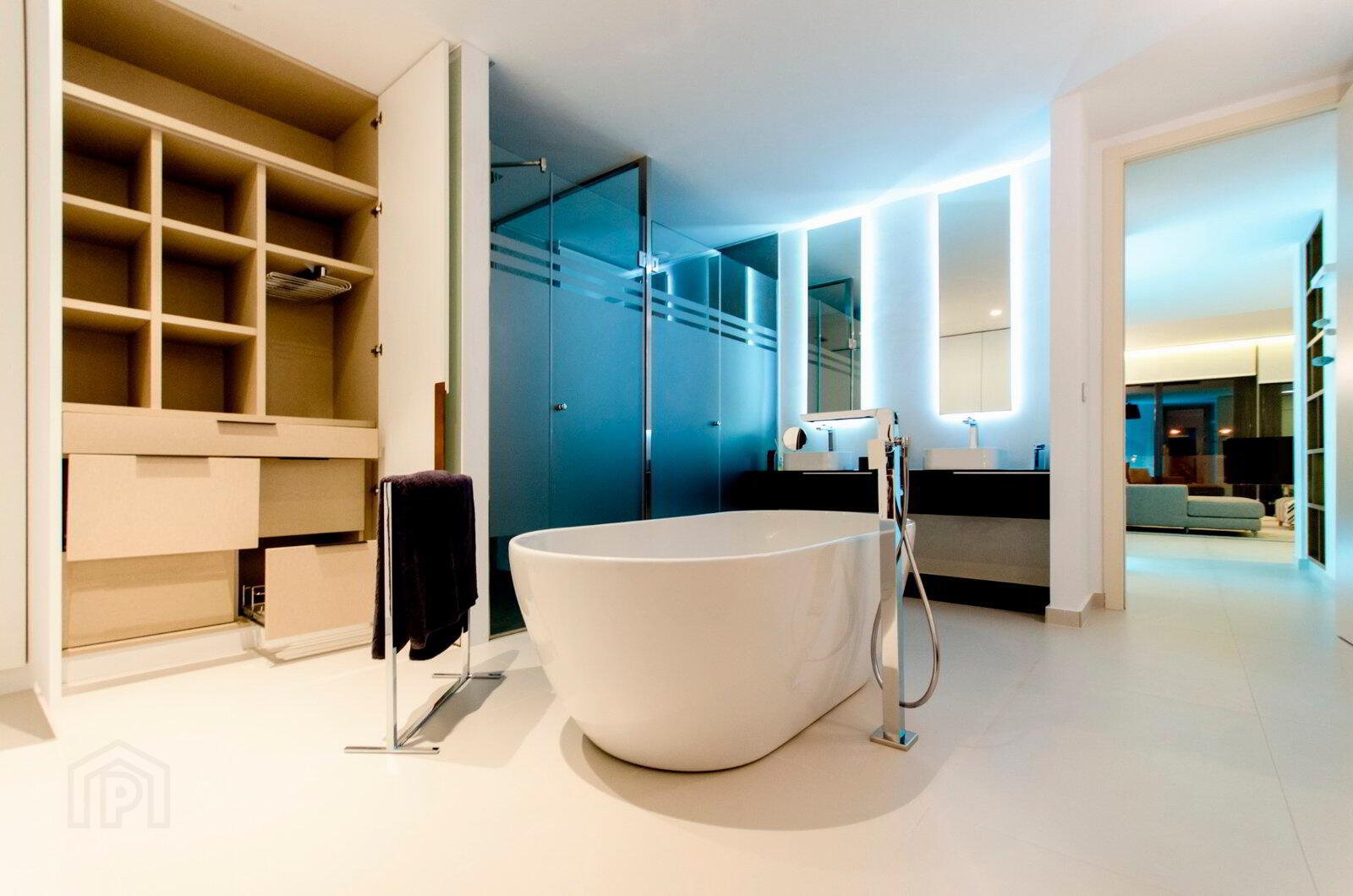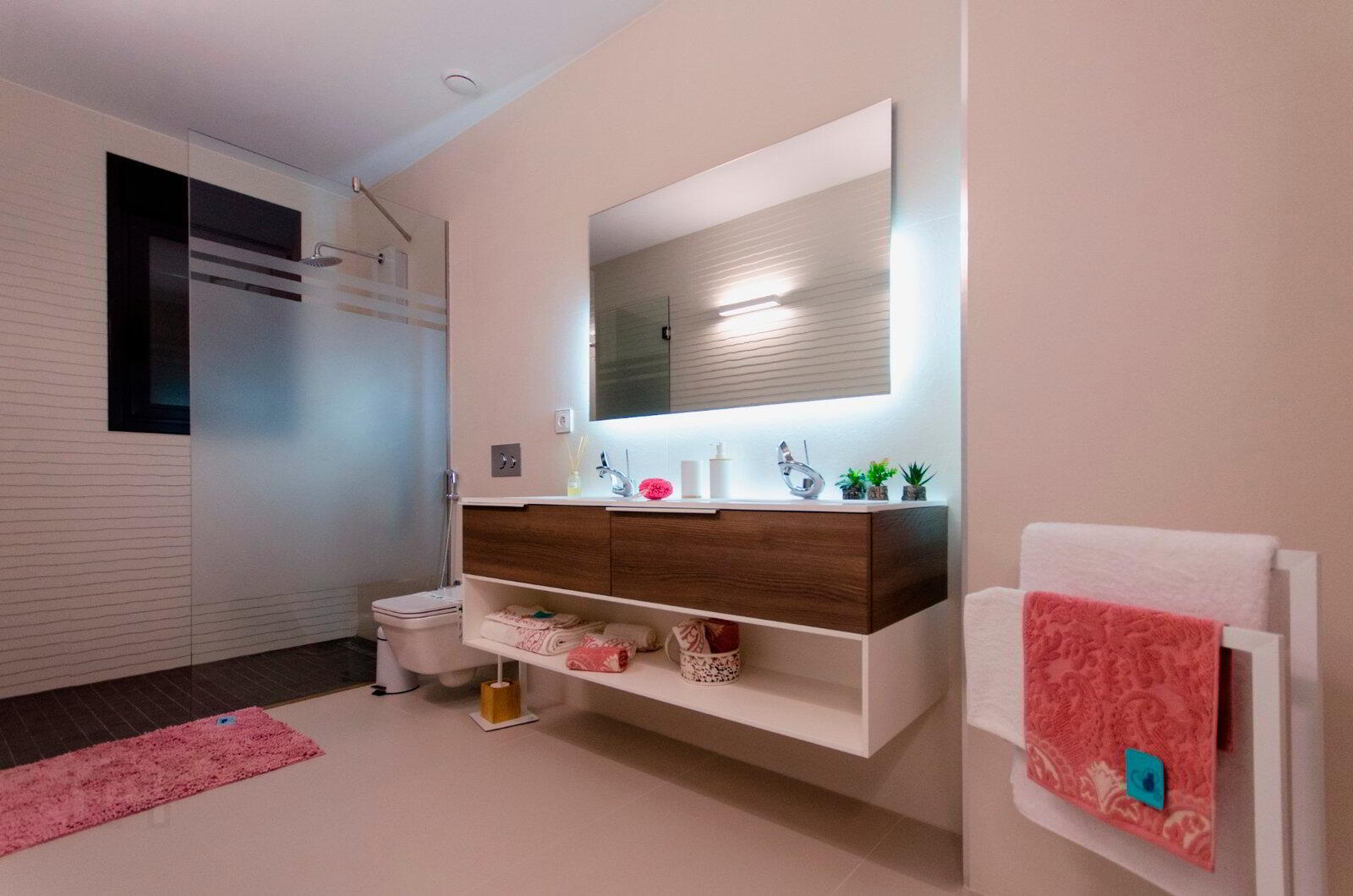 - Built-in wardrobes lined with textile, drawer units and LED lights inside.